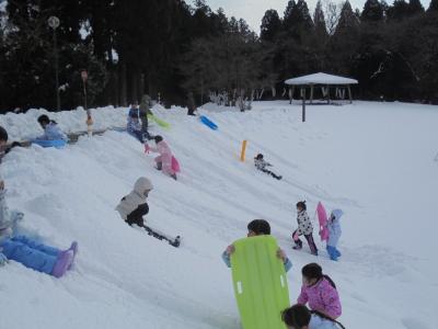 運動場の傾斜を利用してソリで滑ったり、雪の上に寝転んでみたりと、熱中して遊んでいました。