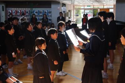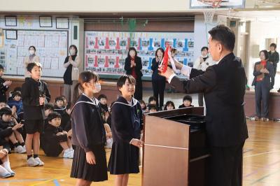 6年児童が代表として、図書委員から賞状を受け取りました。