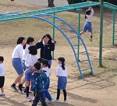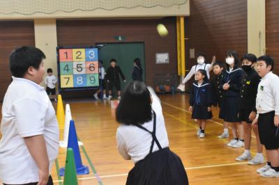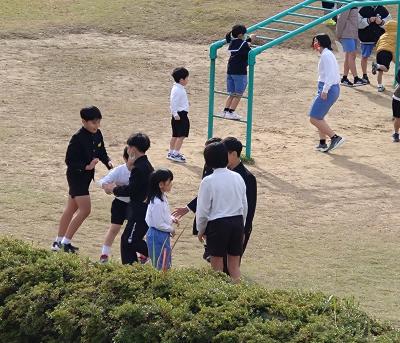 昼休みに6年生と1年生が中庭で遊ぶ姿がみられました。