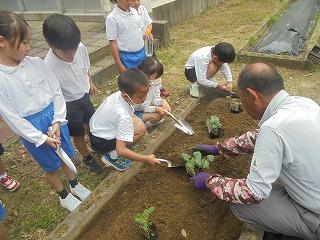 地域のボランティアの皆さんに来ていただき畑に野菜を植えました。