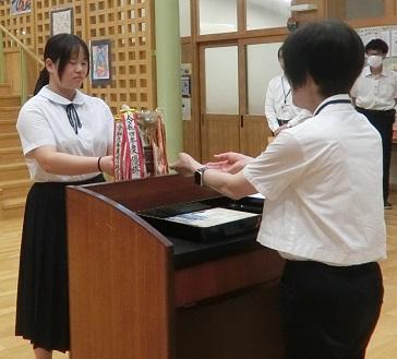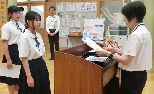 先日行われました、県中学校陸上競技大会の納賞とまなVistaの表彰式がありました。9年生は、優勝カップと賞状を納賞しました。北信越でも頑張ってほしいですね。今回の期末テストのまなVistaには、7年生と8年生が表彰されました。文武両道で、努力してほしいです。