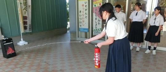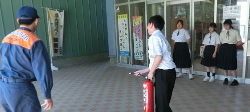 シェイクアウトいしかわに参加し、地震の際の避難行動の訓練と地震後に火災が起きた想定での火災避難訓練を行いました。消防署の方に来ていただき、訓練についての講評をいただきました。「真剣に訓練ができており、とても良かったです。」という講評をいただきました。また、消防署の方々からは、消火器の使い方を教えていただき、消火器を使った初期消火の訓練も行いました。
