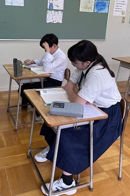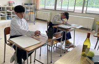 少人数ですが、授業で学習にもがんばっています。8年生は一人一台端末を使って、自分の考えをまとめていました。言葉を変えたり、文の前後を入れ替えたりと、試行錯誤しながら推敲し、よりよいまとめになるようにしていました。7年生は美術の授業で、デッサンに取り組んでいました。実物をよく観察して、描くという、実際にあるものと対峙することで学びを深めていました。