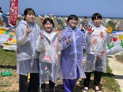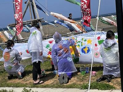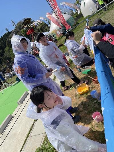 また、生徒4名で鯉のぼりペイントパフォーマンスを行いました。自分たち自身も絵具に染まりながら、曲に合わせて鯉のぼりに素敵な絵を描きました。多くの方々に見ていただき、応援していただき、とても嬉しかったですね。大谷ガチャも完売しました。