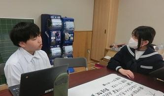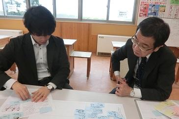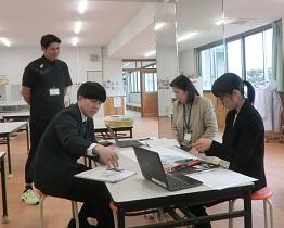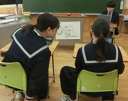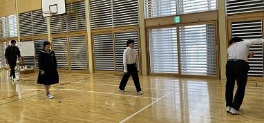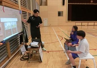 7年生の体育の授業を参観して、先生方も学びました。7年生は、陸上競技のハードルをしていたのですが、「ハードルを速く跳び越すにはどうすればよいか」について、ICTを活用してポイントを話し合ったり、互いに跳ぶ姿を見合って、アドバイスし合うことを通して課題解決に向かっていました。授業の終わりには、2人とも最初よりもずいぶん速く跳び越すことができていました。その後、先生方で話し合いを通して授業について学び合いました。