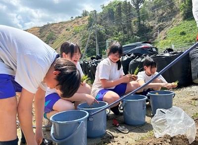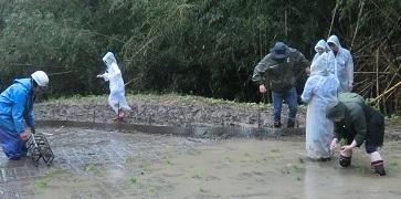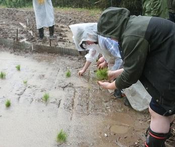 昨年度は地震の影響もあり、黒米では米作りは実施できなかったのですが、今年はみんなで種籾を蒔いてお世話した黒米の苗を植えることができました。当日は雨模様だったのですが、田植え雨という言葉もあり、雨の日の田植えは、苗の生育にとって良いそうです。平家の郷構想研究会の皆さんや保護者の皆さん、地域の方々と一緒に泥んこになりながら田植えを終えることができました。次は、案山子づくりをします。