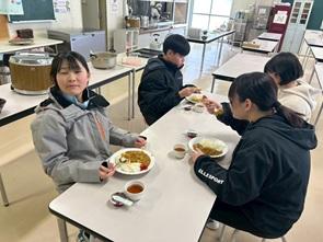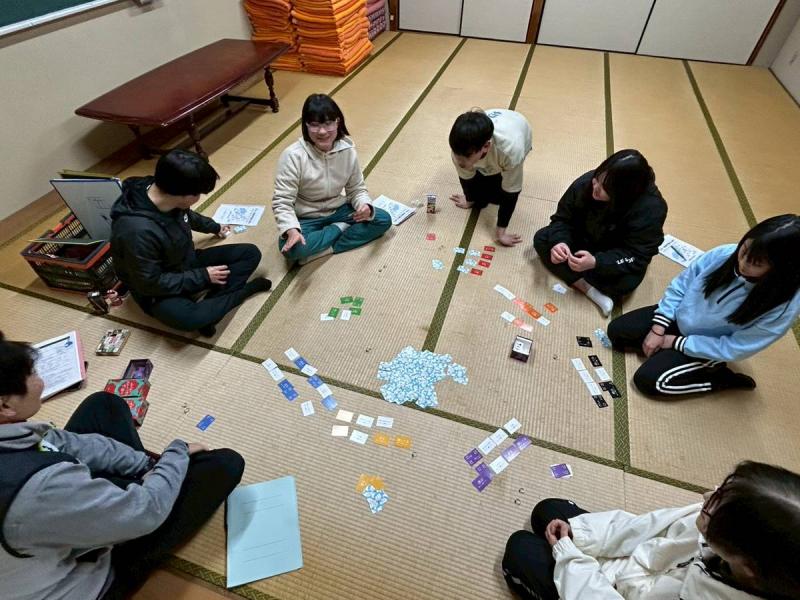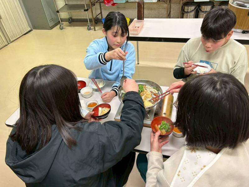 スキー実習を終えて、夕食の鍋料理で体を温めました。夜は、ミーティングをし、1日の活動を振り返りました。明日は、目標の「全員シュテムターンができるようになる」が達成できるように作戦を立てました。その後はリクリエーションをし、楽しく親睦を深めました。