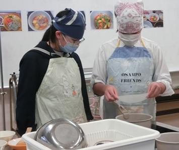 7年生は後期課程になって初めての調理実習を行いました。2人で協力して「肉じゃが」を作りました。学習したことを生かし、手際よく作ることができました。完成した肉じゃがは、見本の写真のようにおいしそうに出来上がりました。香りもよく、食欲をそそりました。味も素材の味を生かした、優しい味付けでした。大変おいしい肉じゃがでした。7年生2人も大満足でした。