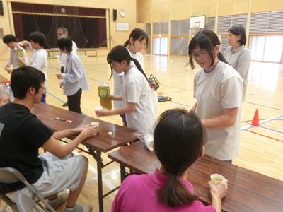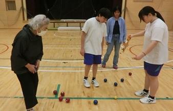 今回の「人の輪」はペタンクでした。地域の方々がペタンクで交流し、体を動かせるように、生徒が主体となって運営を行いました。学校の体育館に訪れた方々の中には、「ペタンクってどんながかわからんから、見に来たわ」という方もおいでましたが、生徒たちの説明の後はみんな一緒に競技をして楽しんでいました。地域の方の感想には「学生さんと楽しめてよかったです。」「誰もが参加しやすく、体を動かせるのでよかったです。」「どうやって説明するかなど子どもたちが考えたうえで進めていただき、うれしかったです。」というものがありました。とても盛り上がり、みんなが楽しめる時間となりました。