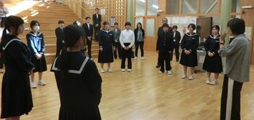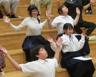 緒方まゆみさんを講師に迎え、三崎中学校の生徒のみなさんと一緒に音楽の交流授業を行いました。互いに文化祭で発表するという合唱曲を披露し、交流を行いました。合唱の交流からは、それぞれの良さを感じることができましたし、自分たちの課題を見つけることもできました。緒方先生とは、音楽を楽しみ、表現力を高めるワークショップを行いました。音楽に合わせて手をたたいたり、歩いたりする中で、体で音楽を表現する楽しさを体験しました。声の出し方や歌い方を学び、最後は「ありがとう」という言葉をカデンツァで合唱して終わりました。