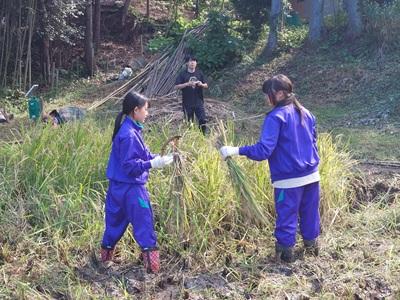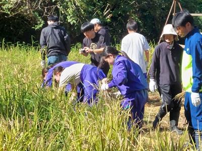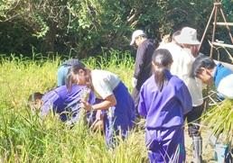 5月にみんなで田植えをした黒米が実りました。晴れ渡った天気の中、みんなで稲刈りをしました。稲を束ねてわらで結ぶことは昨年も経験したことなのですが、なかなかうまくできず、苦戦しました。それでも協力して、稲架にかけ終わったときは、満足感でいっぱいでした。10日ほどで乾くということです。お米になるのが楽しみですね。