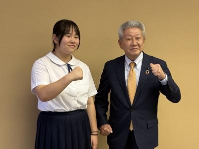 JOCジュニアオリンピックカップ第56回U16陸上競技大会において、石川県代表として女子円盤投げに出場する9年生が、珠洲市長さんのところに、表敬訪問に伺いました。9年生は「目標は2つあります。1つ目は、32m以上の記録を出すことです。2つ目はベスト8に残り、決勝に進むことです。」と力強く決意を述べました。市長さんからは、「珠洲市から全国大会へ出場することは素晴らしいことです。スポーツでがんばる姿は、復興の力になります。ぜひ、力を出し切って頑張ってきてください。」との激励の言葉をいただきました。