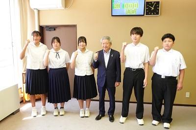 9年生は、8月8日に行われる北信越中学校陸上競技大会に出場します。今日は、同様に北信越大会に出場する緑丘中学校の陸上部と相撲部の生徒とともに珠洲市長さんと教育長さんのところに表敬訪問に行きました。「目標は優勝です」と堂々と抱負を述べました。応援してますので、頑張って力を出し切ってほしいです。