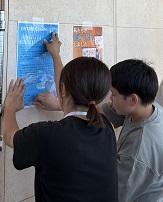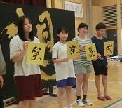 重茂 9年生の北信越陸上競技大会出場を祝して、垂れ幕を書道家の阿部豊寿さんが書いてくださいました。さらに、大谷小中学校に来校していただき、書道パフォーマンスを披露していただきました。「想」という文字と「大谷と共に」という文字を思いを込めて、ダイナミックに描かれる姿に感動しました。「想」の文字はだんだん広場に飾ります。また、生徒は金の色紙に自分の好きな文字を書いていただきました。