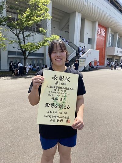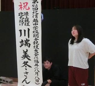 北信越中学校陸上競技大会に共通女子砲丸投げで出場した9年生は、自己ベストの11m93で3位となりました。大きな大会でも自分の力を出し切り、自己ベストの記録を出せたことは素晴らしいと思います。陸上競技を通して、様々なことを学び取ることができた9年生の今後の活躍に期待したいです。