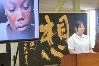 全校登校日の今日は、「平和」について考えました。1人1人が戦争に関する1枚の写真を選び、自分の思いや考えを発表しました。「小さな爆弾で、たくさんのものを破壊してしまうので、爆弾は使わないでほしいし、作らないでほしいと思いました。」などの発表がありました。様々な切り口で平和について発表しあうことで、考えが広がったり、深まったりしました。