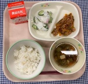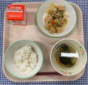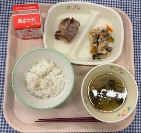 今日の給食献立は、白ごはん・鶏肉の塩こうじ焼き・しらたきのさっと煮・たまねぎのすまし汁・牛乳でした。