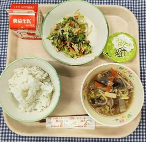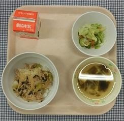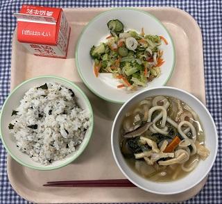 今日の給食献立は、わかめごはん・キャベツとちくわの梅和え・五目うどん・牛乳でした。