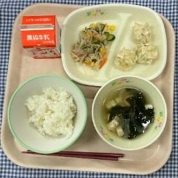 今日の給食献立は、白ごはん・豆腐シュウマイ・切干大根の中華サラダ・干しシイタケのスープ・牛乳でした。