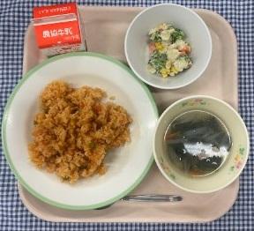 今日の給食献立は、チキンライス・ブロッコリーのゴママヨサラダ・ほうれん草とベーコンのコンソメスープ・牛乳でした。