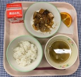今日の給食献立は、白ごはん・ふくらぎの野菜あんかけ・珠洲産わかめと豆腐のみそ汁・オレンジ・牛乳でした。