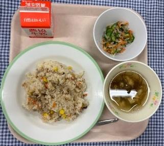 今日の給食献立は、五目チャーハン・もずくの中華スープ・もやしのナムル・牛乳でした。