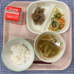 今日の給食献立は、白ごはん・焼肉サラダ・にらたっぷりスープ・牛乳でした。