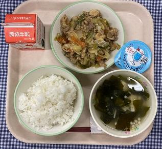 今日の給食献立は、白ごはん・ホイコーロー・とろみわかめスープ・ソーダフロート風ゼリー・牛乳でした。