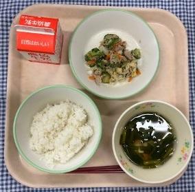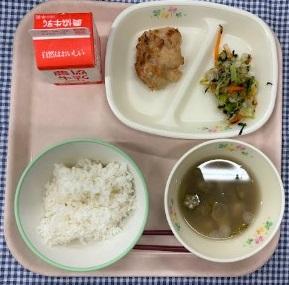 今日の給食献立は、白ごはん・鶏肉の竜田揚げ焼き・磯香和え・おくらのみそ汁・牛乳でした。