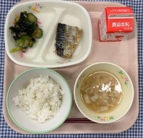 今日の給食献立は、白ごはん・さばのみぞれ煮・わかめときゅうりの酢の物・野菜たくさん粕汁・牛乳でした。