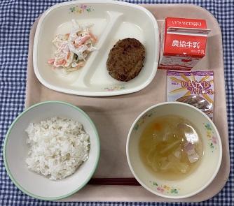 今日の給食献立は、白ごはん・かみかみごぼうハンバーグ・いかくんサラダ・キャベツと豆のスープ・いもけんぴパリッシュ・牛乳でした。