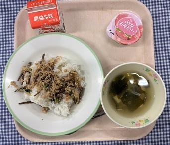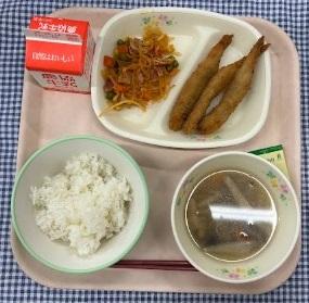 今日の給食献立は、白ごはん・ししゃもフライ・切干ナポリタン・ごぼうとしめじのみそ汁・よくかむふりかけ・牛乳でした。きょうはかむかむメニューでした。