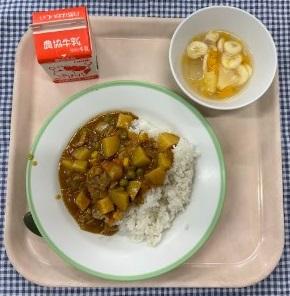 今日の給食献立は、ポークカレー・フルーツポンチ・福神漬け・牛乳でした。
