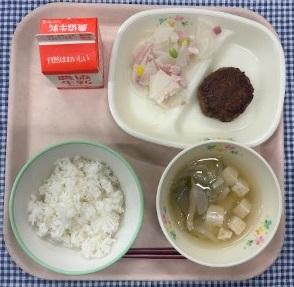 今日の給食献立は、ハンバーグ・大根とハムのサラダ・しめじのコンソメスープ・牛乳でした。