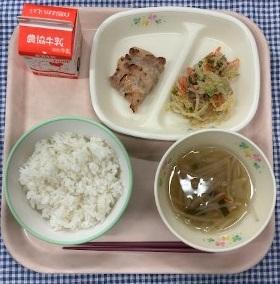 今日の給食献立は、白ごはん・鶏肉の香草焼き・春野菜のソテー・ほうれん草のコンソメスープ・牛乳でした。