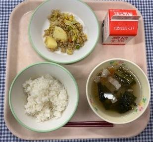 今日の給食献立は、白ごはん・じゃがいものインド風煮・大根とベーコンのスープ・牛乳でした。