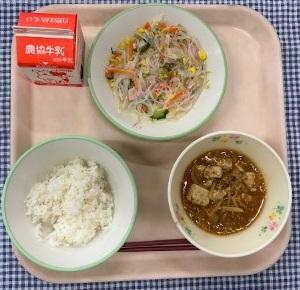 今日の給食献立は、白ごはん・春雨サラダ・マーボー豆腐・牛乳でした。