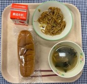 今日の給食献立は、コッペパン・焼きそば・ほうれん草のみそ汁・牛乳でした。
