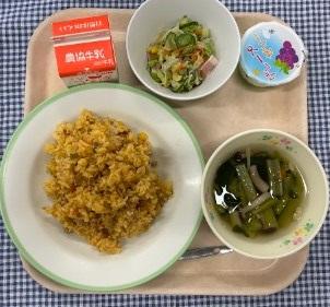 今日の給食献立は、ジャンバラヤ・イタリアンサラダ・小松菜のスープ・グレープゼリー・牛乳でした。