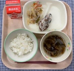今日の給食献立は、白ごはん・さばのたつたあげ・たけのこのおかか煮・いわのりのすまし汁・牛乳でした。