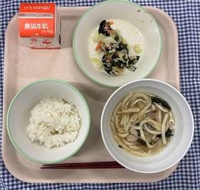 今日の給食献立は、白ごはん・キャベツとツナの酢の物・五目うどん・牛乳でした。