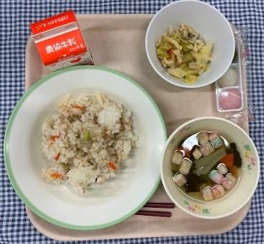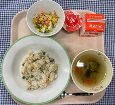 今日の給食献立は、チキンピラフ、コールスローサラダ、ブロッコリーコンソメスープ、リンゴゼリー、牛乳でした。