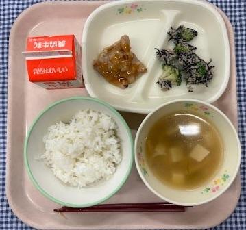 今日の給食献立は、白ごはん・鶏肉の照り焼き・おからのひじきの和サラダ・じゃがいもと油揚げのみそ汁・牛乳でした。