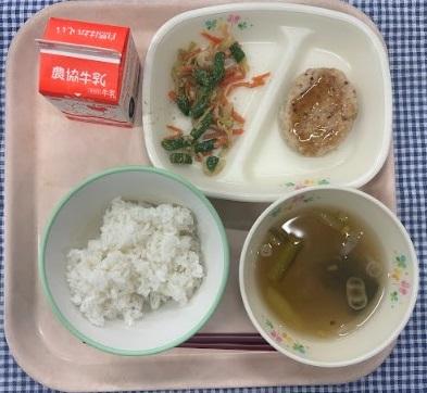 今日の給食献立は、白ごはん・豆腐ハンバーグ・いんげんの胡麻和え・小松菜と玉ねぎのみそ汁・牛乳でした。