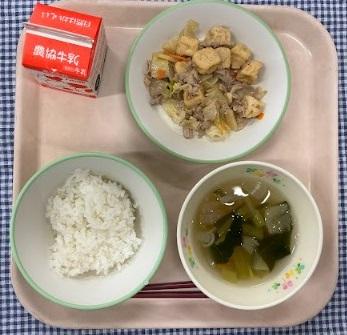 今日の給食献立は、白ごはん・厚揚げと豚肉のみそ炒め・小松菜とコーンの中華スープ・牛乳でした。