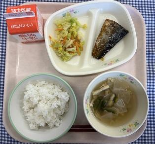 今日の給食献立は、白ごはん・さばのしょうが煮・キャベツとちくわの酢みそ和え・いんげんと大根の味噌汁・牛乳でした。