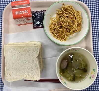 今日の給食献立は、食パン・ミートソーススパゲティ・野菜たっぷりポトフ・チョコスプレッド・牛乳でした。
