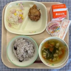 今日の給食献立は、黒豆ごはん・鶏のからあげ・紅白サラダ・豆腐とえのきのすまし汁・おめでとうゼリー・牛乳でした。