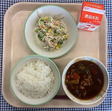 今日の給食献立は、白ごはん・切干大根のゴママヨ和え・ポークシチュー・牛乳でした。
