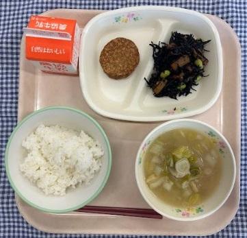 今日の給食献立は、白ごはん・メンチカツ・ひじきの煮物・野菜たくさん粕汁・牛乳でした。